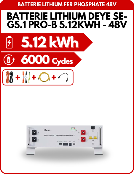 Batterie Lithium Deye SE-G5.1 PRO-B 5.12KWH – 48V La Batterie Lithium Deye SE-G5.1 PRO-B 5.12 kWh – 48 V est une solution de stockage d’énergie moderne et performante conçue pour répondre aux besoins croissants d’autonomie énergétique dans les installations résidentielles et tertiaires. Robuste et fiable, elle permet de stocker l’énergie produite par une installation photovoltaïque afin de l’utiliser à tout moment de la journée, même en l’absence de soleil ou lors de coupures de réseau. Grâce à son design compact et soigné, elle s’intègre facilement dans différents environnements tout en offrant un excellent rapport entre performance, durée de vie et coût d’exploitation. La gamme Deye s’est imposée comme un acteur majeur du marché du stockage grâce à des solutions innovantes et une compatibilité étendue avec les onduleurs hybrides. La SE-G5.1 PRO-B en est l’illustration parfaite, combinant sécurité, modularité et puissance pour accompagner efficacement les foyers dans leur transition énergétique. . Un peu plus d’infos sur le fonctionnement de la batterie Technologie LiFePO₄ et nouveautés La batterie repose sur la technologie LiFePO₄ (Lithium-Fer-Phosphate), l’une des plus avancées et fiables disponibles aujourd’hui. Ce choix technologique présente de nombreux avantages : une sécurité renforcée grâce à une meilleure stabilité chimique, une résistance accrue aux hautes températures et une durée de vie prolongée avec un grand nombre de cycles de charge et de décharge. Contrairement aux batteries utilisant d’autres compositions lithium, la LiFePO₄ réduit considérablement les risques de surchauffe et d’emballement thermique, ce qui en fait une solution idéale pour les installations résidentielles où la sécurité est une priorité. La SE-G5.1 PRO-B intègre également des optimisations récentes, permettant une gestion plus fine de la charge et une meilleure réactivité dans les phases de décharge, garantissant ainsi une utilisation optimale de chaque kilowattheure stocké. Ces innovations se traduisent par une meilleure efficacité énergétique globale et une fiabilité accrue sur le long terme. Évolutivité sans limite ! L’un des points forts de la Deye SE-G5.1 PRO-B est sa conception modulaire. Chaque unité offre une capacité utile de 5,12 kWh, et il est possible d’ajouter plusieurs modules pour adapter l’installation aux besoins énergétiques de chaque utilisateur. Que ce soit pour une petite maison souhaitant simplement améliorer son taux d’autoconsommation ou pour une installation de grande envergure nécessitant une autonomie énergétique renforcée, la modularité permet de dimensionner le système avec précision. L’ajout de modules supplémentaires est simple et rapide, ce qui facilite l’évolution du système en fonction de l’augmentation de la consommation, par exemple en cas d’acquisition d’un véhicule électrique ou d’un agrandissement du logement. Cette évolutivité rend l’investissement pérenne et assure que la batterie pourra accompagner le foyer sur le long