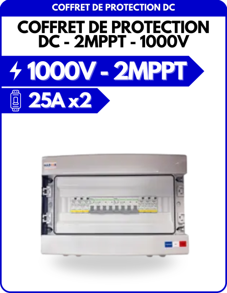 Ce coffret de protection électrique photovoltaïque permet de protéger le côté DC (courant continu) de l’installation. Il intègre l’ensemble des éléments nécessaires permettant une protection optimale : sectionneurs, parafoudres, etc. Ce coffret permet de protéger deux entrées indépendantes (ou deux MPPT). La tension maximale admissible en entrée est de 1000VDC.