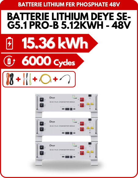 Batterie Lithium Deye SE-G5.1 PRO-B 5.12KWH – 48V La Batterie Lithium Deye SE-G5.1 PRO-B 5.12 kWh – 48 V est une solution de stockage d’énergie moderne et performante conçue pour répondre aux besoins croissants d’autonomie énergétique dans les installations résidentielles et tertiaires. Robuste et fiable, elle permet de stocker l’énergie produite par une installation photovoltaïque afin de l’utiliser à tout moment de la journée, même en l’absence de soleil ou lors de coupures de réseau. Grâce à son design compact et soigné, elle s’intègre facilement dans différents environnements tout en offrant un excellent rapport entre performance, durée de vie et coût d’exploitation. La gamme Deye s’est imposée comme un acteur majeur du marché du stockage grâce à des solutions innovantes et une compatibilité étendue avec les onduleurs hybrides. La SE-G5.1 PRO-B en est l’illustration parfaite, combinant sécurité, modularité et puissance pour accompagner efficacement les foyers dans leur transition énergétique. . Un peu plus d’infos sur le fonctionnement de la batterie Technologie LiFePO₄ et nouveautés La batterie repose sur la technologie LiFePO₄ (Lithium-Fer-Phosphate), l’une des plus avancées et fiables disponibles aujourd’hui. Ce choix technologique présente de nombreux avantages : une sécurité renforcée grâce à une meilleure stabilité chimique, une résistance accrue aux hautes températures et une durée de vie prolongée avec un grand nombre de cycles de charge et de décharge. Contrairement aux batteries utilisant d’autres compositions lithium, la LiFePO₄ réduit considérablement les risques de surchauffe et d’emballement thermique, ce qui en fait une solution idéale pour les installations résidentielles où la sécurité est une priorité. La SE-G5.1 PRO-B intègre également des optimisations récentes, permettant une gestion plus fine de la charge et une meilleure réactivité dans les phases de décharge, garantissant ainsi une utilisation optimale de chaque kilowattheure stocké. Ces innovations se traduisent par une meilleure efficacité énergétique globale et une fiabilité accrue sur le long terme. Évolutivité sans limite ! L’un des points forts de la Deye SE-G5.1 PRO-B est sa conception modulaire. Chaque unité offre une capacité utile de 5,12 kWh, et il est possible d’ajouter plusieurs modules pour adapter l’installation aux besoins énergétiques de chaque utilisateur. Que ce soit pour une petite maison souhaitant simplement améliorer son taux d’autoconsommation ou pour une installation de grande envergure nécessitant une autonomie énergétique renforcée, la modularité permet de dimensionner le système avec précision. L’ajout de modules supplémentaires est simple et rapide, ce qui facilite l’évolution du système en fonction de l’augmentation de la consommation, par exemple en cas d’acquisition d’un véhicule électrique ou d’un agrandissement du logement. Cette évolutivité rend l’investissement pérenne et assure que la batterie pourra accompagner le foyer sur le long
